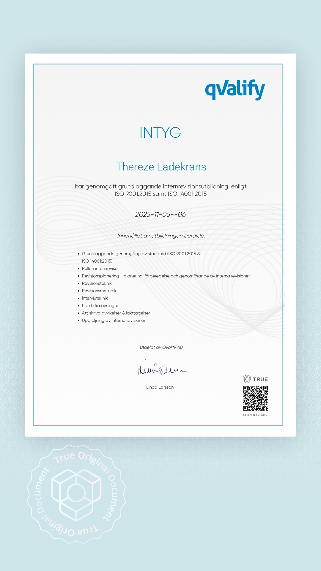 Alla TRUE -document är säkrade med blockchain-teknologi och kan verifieras som äkta. Klicka på verifieringsknappen bredvid dokumentet eller skanna QR-koden med din smartphones kamera. Ingen app krävs - dokumentets äkthet verifieras omedelbart.